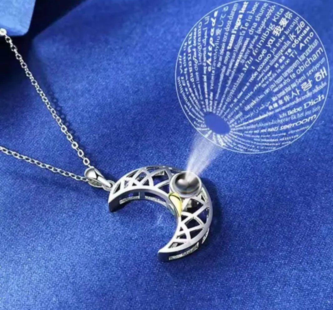 Colgante luna plateada que proyecta “Te amo” en 100 idiomas. 🌙💖