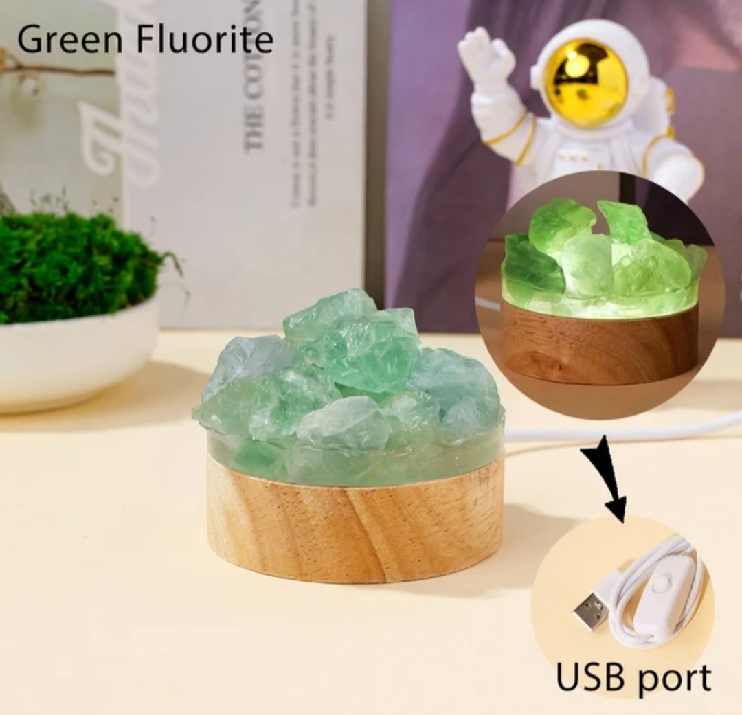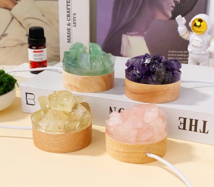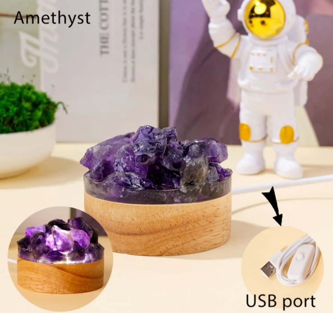 Lámpara de cristal redonda con base de madera y piedras decorativas. Disponible en amatista | citrino | fluorita verde. ✨