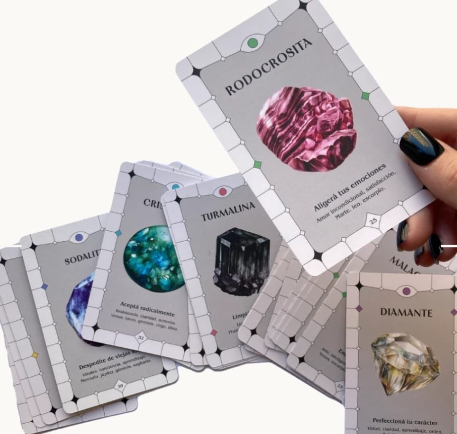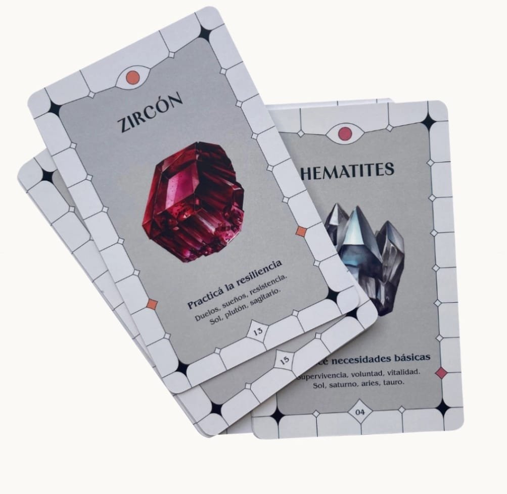 Cartas oraculares inspiradas en la energía de los cristales y minerales ✨. Cada carta funciona como guía espiritual y herramienta de aprendizaje sobre las propiedades energéticas, vitales y astrológicas de cada piedra.