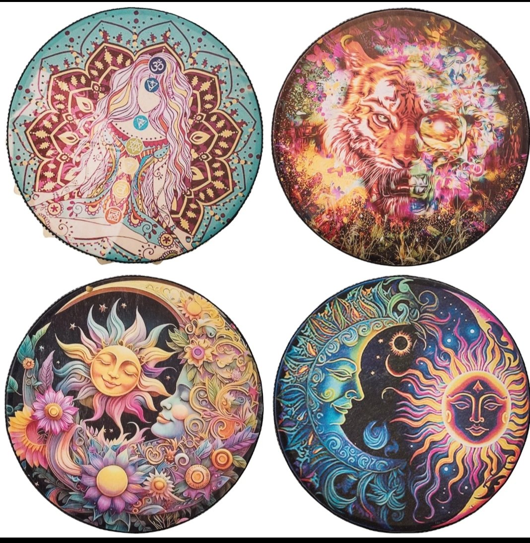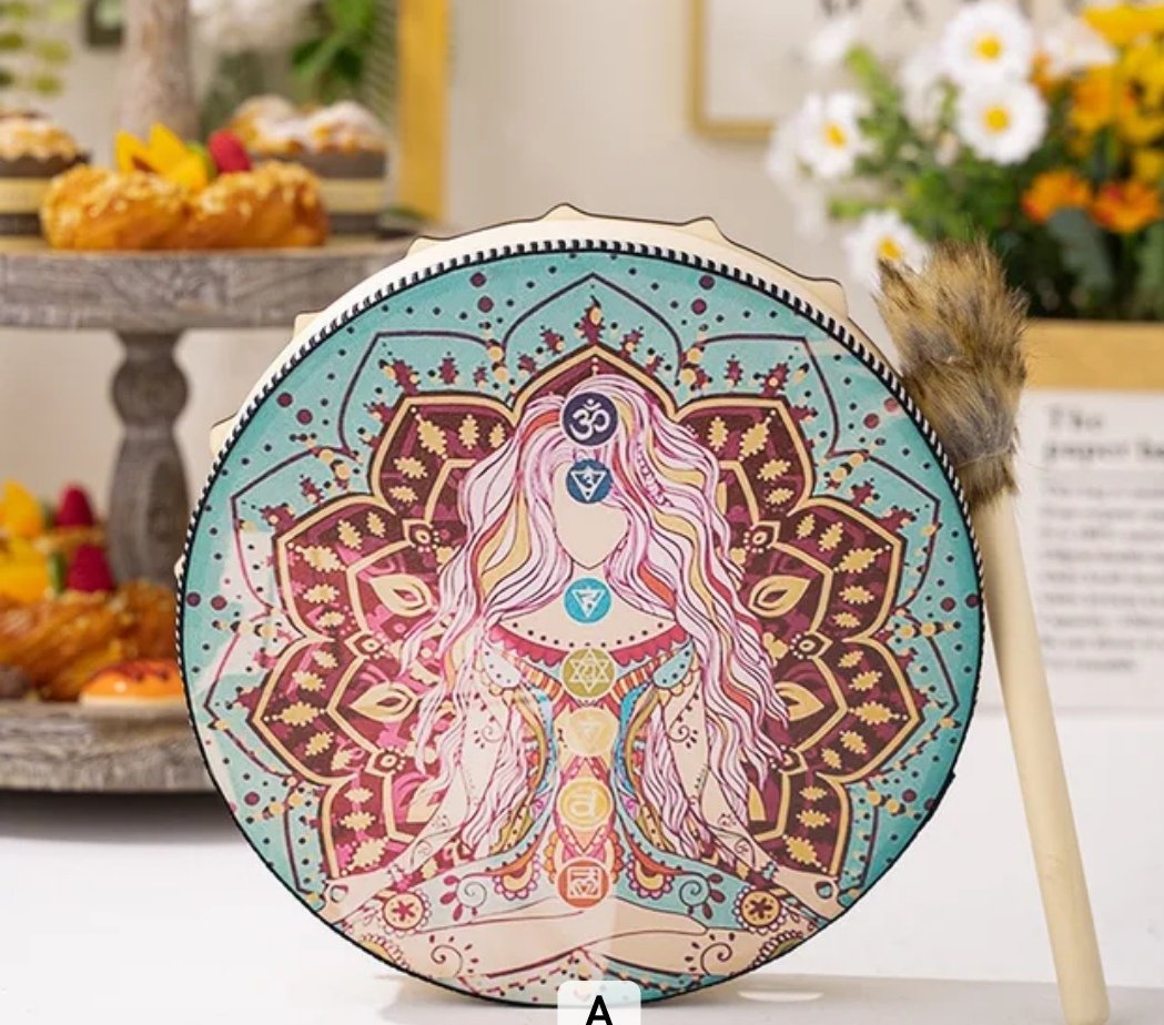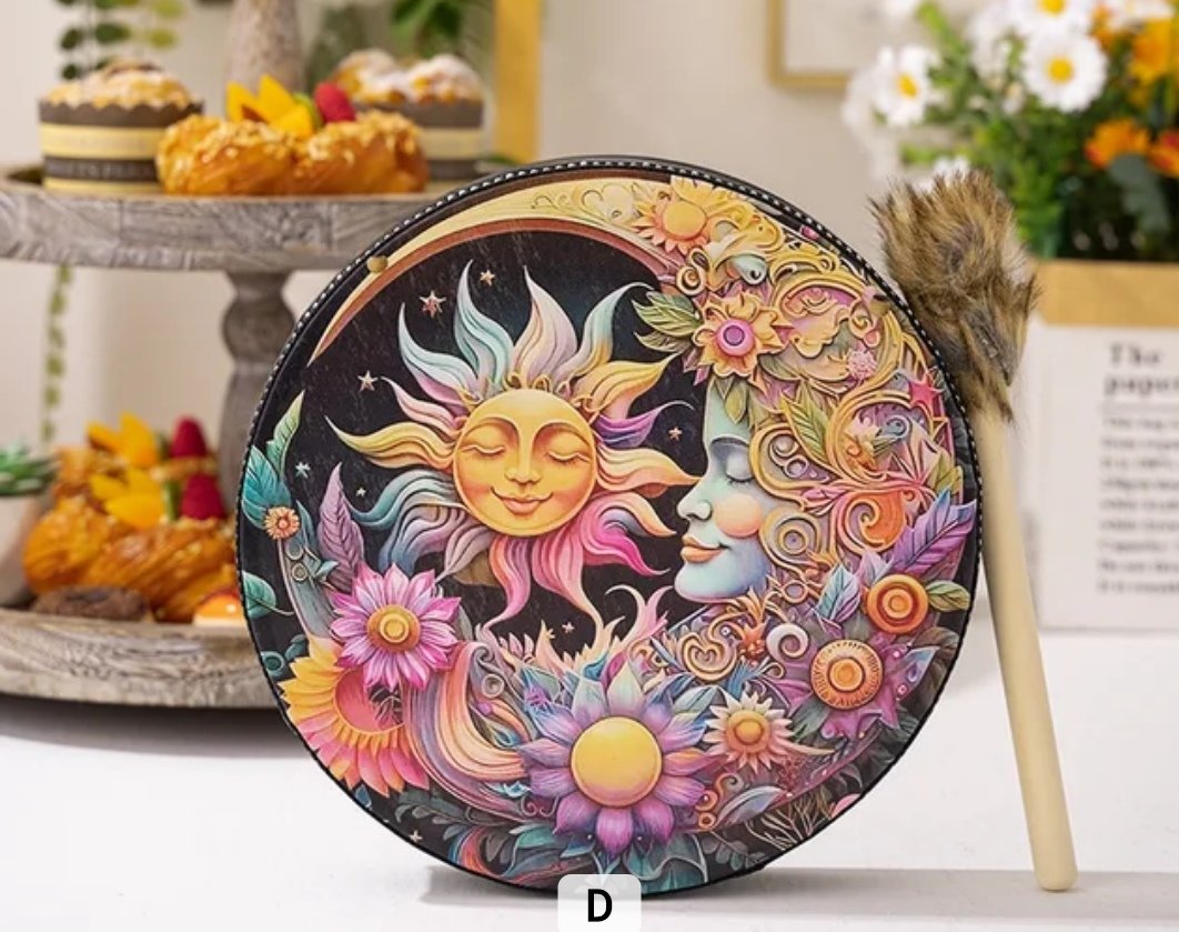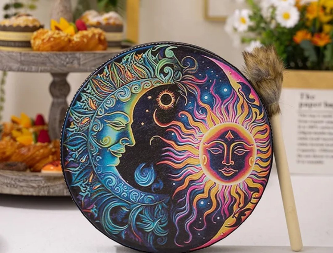 Tambor chamánico artesanal con diseños místicos. Sonido profundo y vibrante que armoniza los espacios.🌙🥁.